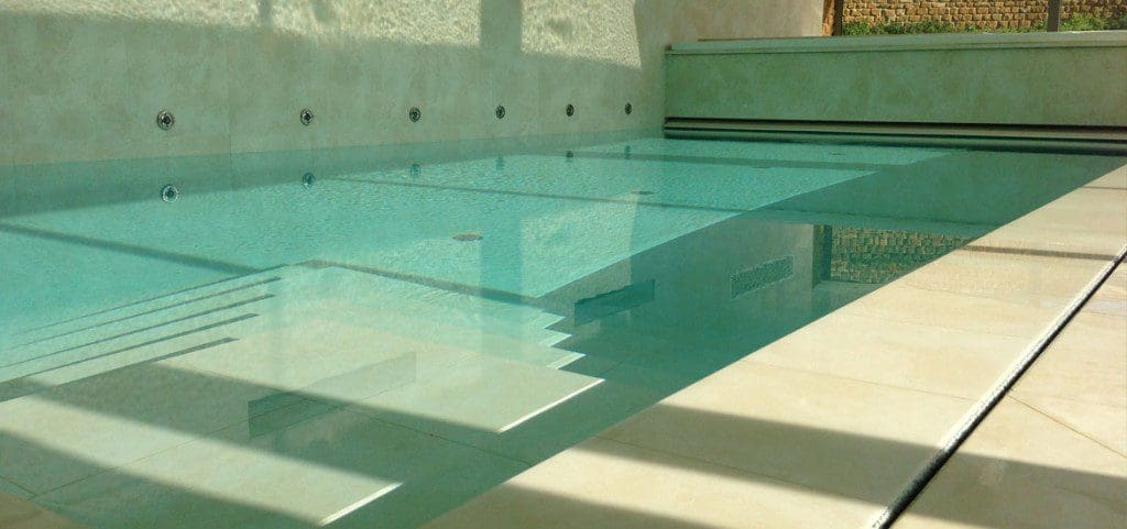 This contemporary design makes use of the same pattern of ceramic tile for both the pool and the surround, to give a sense of continuity. The height of the water is at floor level, removing any visual obstacles between the user and the water, this feature lends itself towards a very inviting atmosphere.